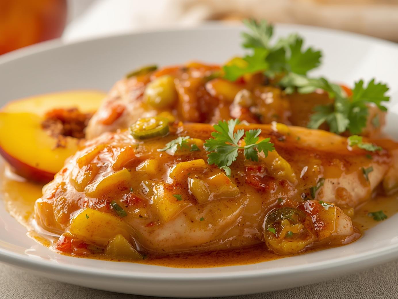 5. Simmer to Perfection: Return the seared chicken breasts to the skillet, nestling them into the peach and jalapeño mixture. Spoon some of the sauce over the top. Reduce the heat to low, cover the skillet, and let it simmer for 10-15 minutes, or until the chicken is cooked through and reaches an internal temperature of 165°F (74°C).